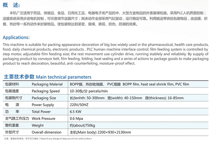 GBZ-300透明膜三維包裝機廣泛適用于藥品、保健品、食品、日用化工品、電器電子類產品的中、大型方盒物品的外表裝璜包裝。